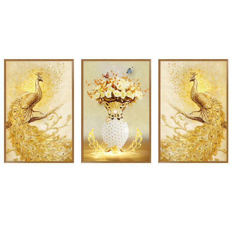满钻钻石画十字绣孔雀花瓶三联画大幅2018新款客厅现代简约点钻绣