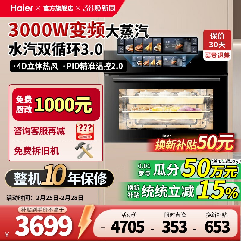 [麦浪]海尔蒸烤一体机嵌入式家用蒸烤箱全自动电蒸箱TCU1免费厨改