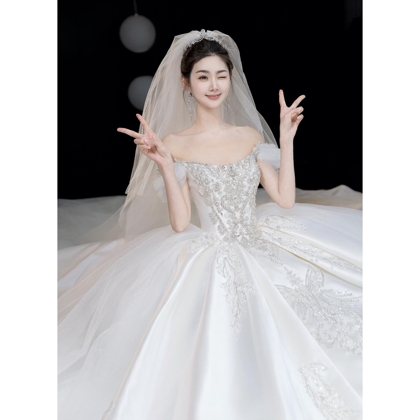缎面主婚纱2025新娘结婚抹胸高级感礼服拖尾订婚宴会一字肩婚纱瑰