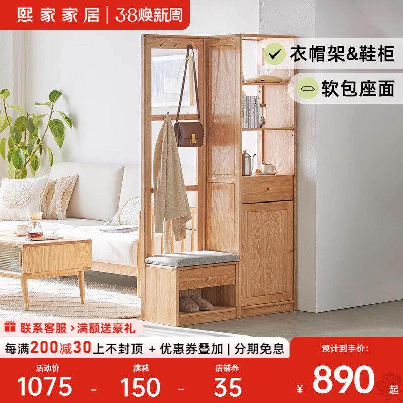 全实木鞋柜换鞋凳一体北欧橡木入户间厅柜隔断柜衣帽架落地玄关柜