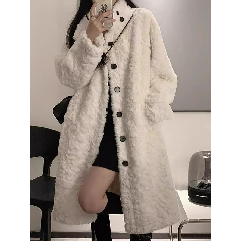 秋冬季加厚新款韩版中长款羊羔毛外套女气质宽松百搭纽扣开衫外衣