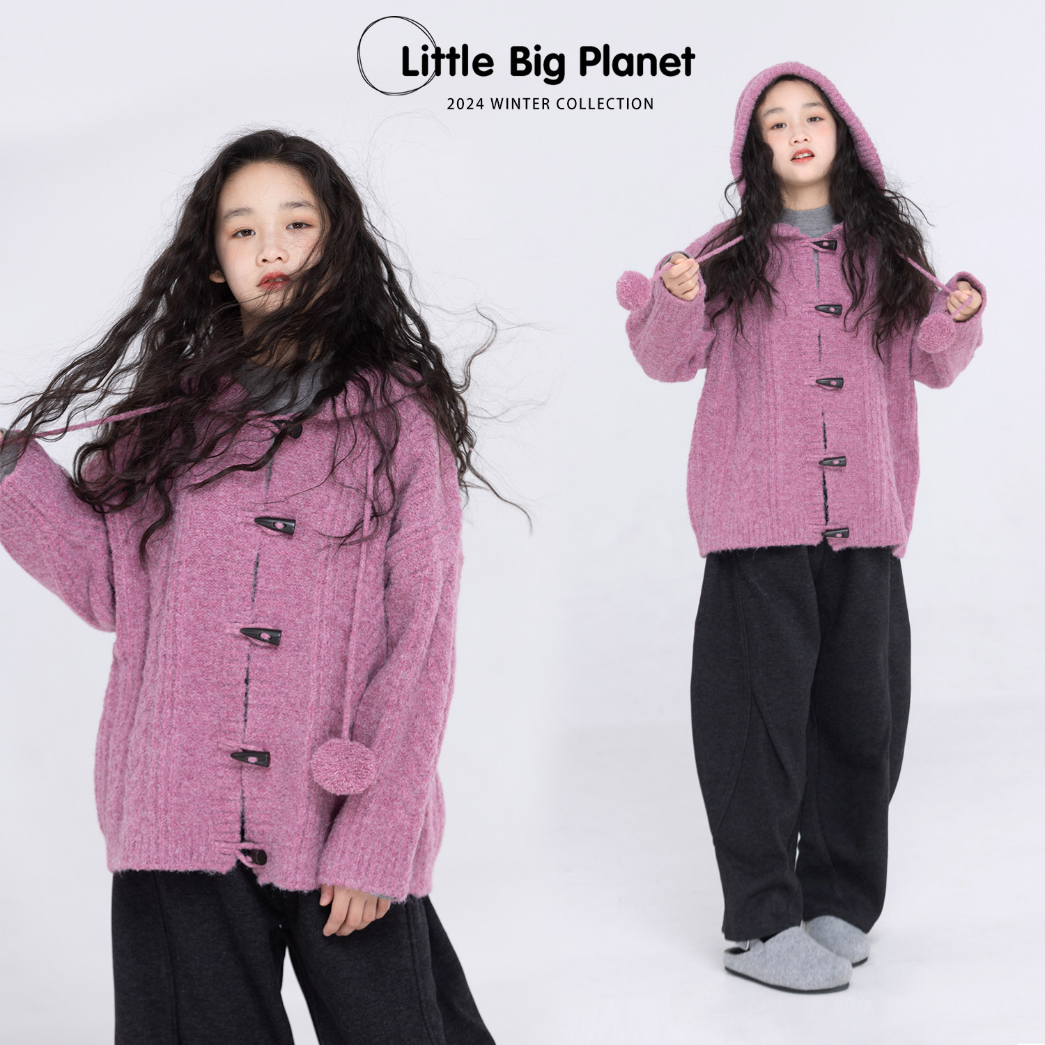 小小大星球童装 慵懒风麻花牛角扣毛衣外套 女童冬季复古连帽开衫
