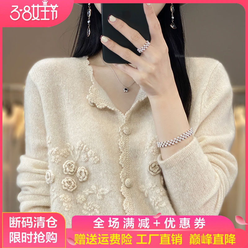 100%纯羊毛开衫女圆领重工钩花毛衣外套宽松甜休闲羊绒衫针织上衣