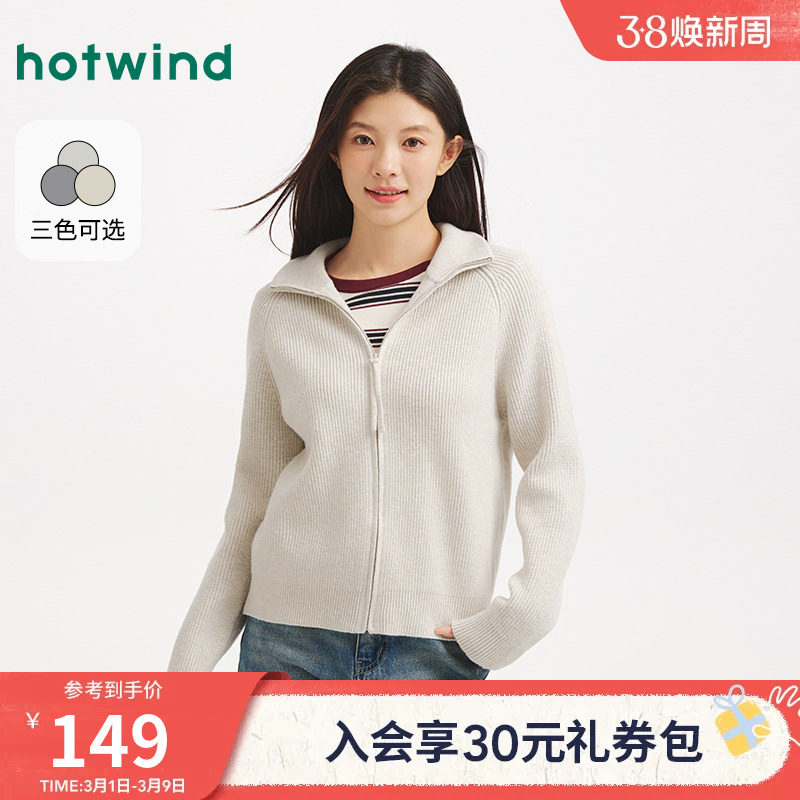 热风女士拉链开衫毛衣2025年冬季新款翻领针织衫保暖毛衣外套