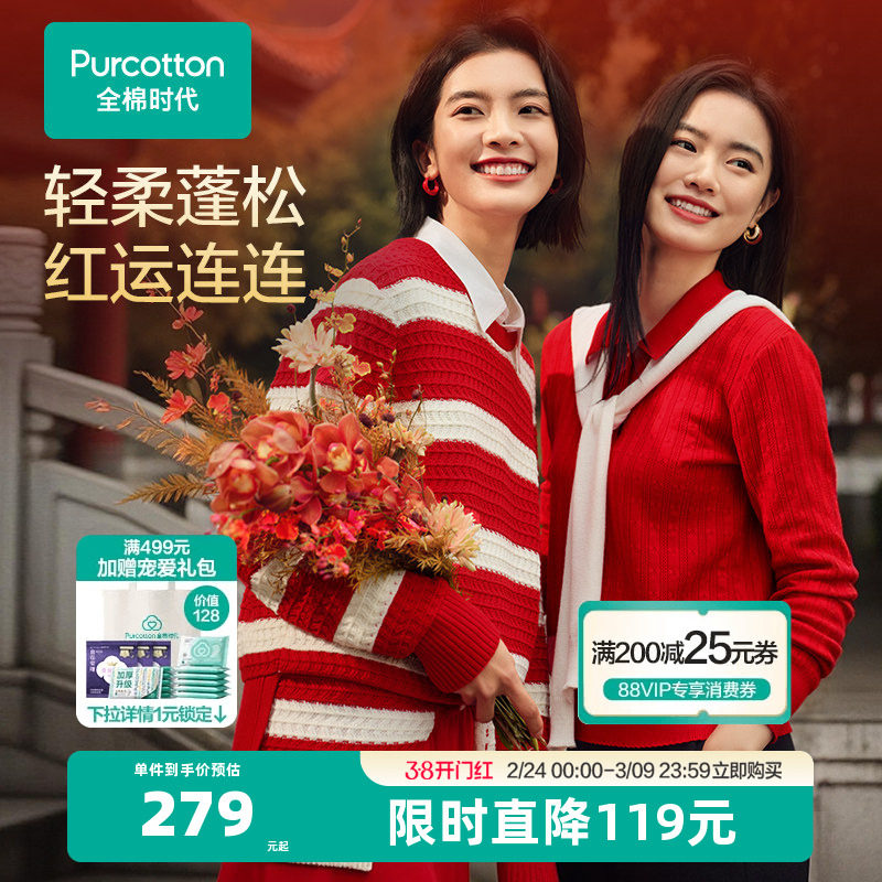 【新春穿红】全棉时代毛衣红色毛衣女新年圣诞马年本命年外套中式