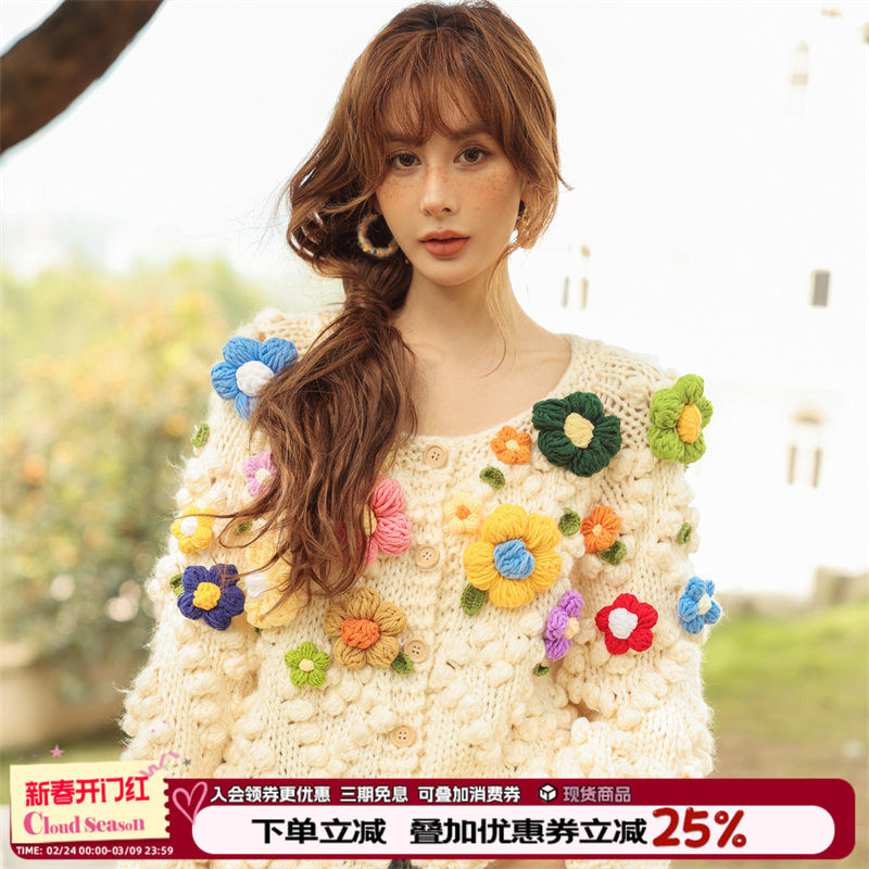CLOUDSEASON彩色花花手打毛衣女2026春秋新款小个子宽松慵懒外套
