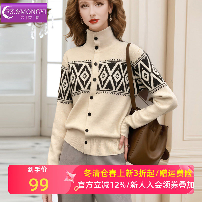 菲梦伊印花立领针织毛衣开衫外套女冬季时尚百搭单排扣设计感上衣