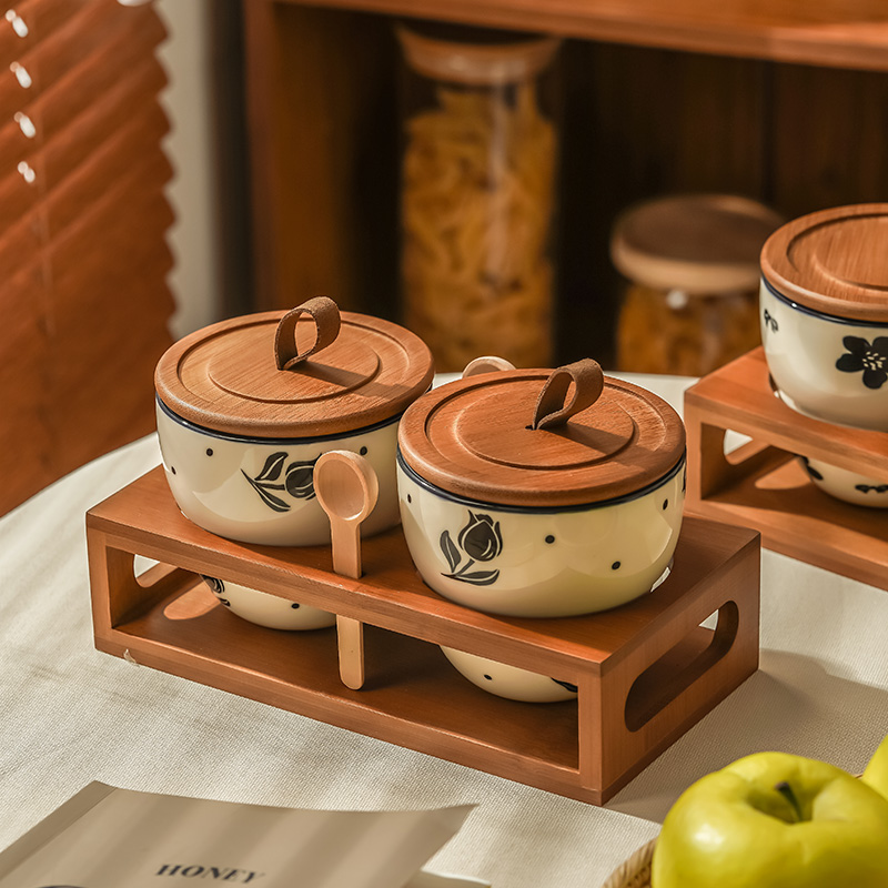 厨房用品调料盒 陶瓷调料罐 味精盐罐竹木架调料盒 套装 家用