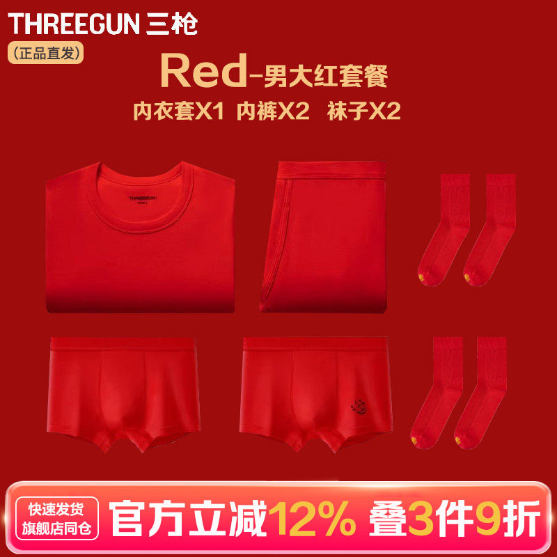 三枪 本命年大红内衣秋衣秋裤棉质中厚套头中青年人大码内衣套装