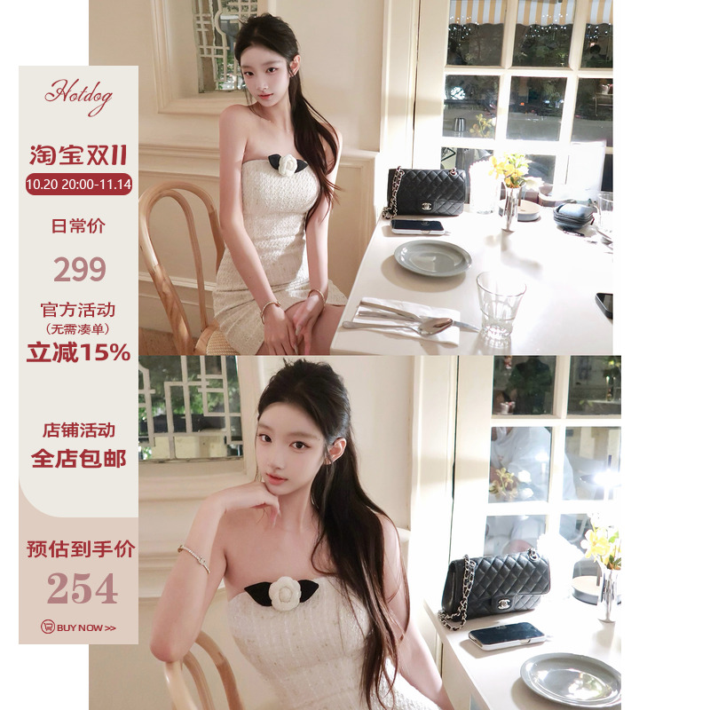 Hotdog 热狗很辣【冬季山茶花】名媛风千金感精致高级抹胸连衣裙