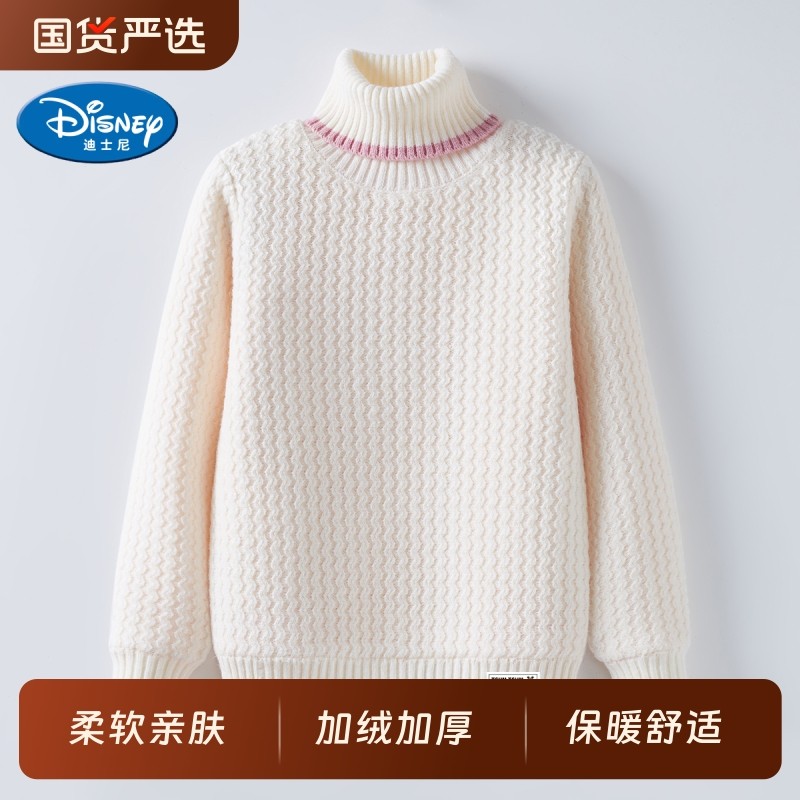 迪士尼女童毛衣中大童2025新款加绒加厚高领针织衫秋冬季白色红色