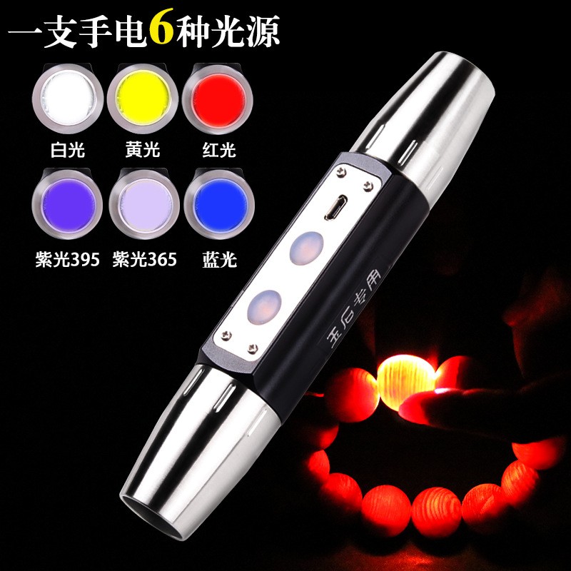 照玉石专用强光手电筒文玩翡翠蜜蜡鉴定双头六光源USB充电小口径