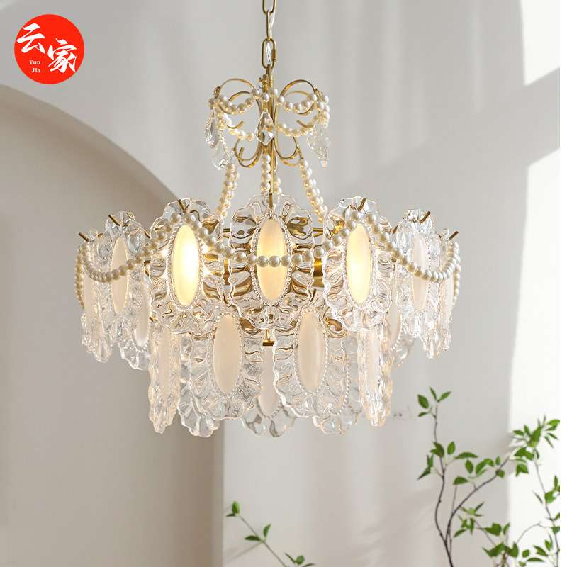 法式珍珠水晶全铜吊灯艺术居卧室轻奢复古灯餐厅客厅灯奶油风灯具