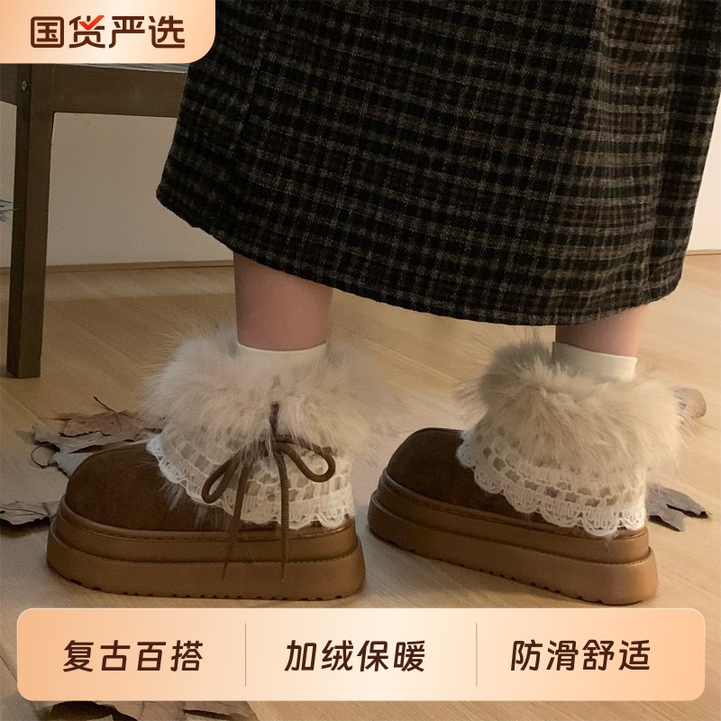 雪地靴细细条 费尔岛毛毛女冬季百搭增高厚底加绒保暖短靴子棉鞋