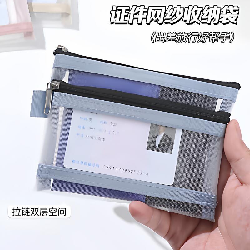 双层透明网纱文件袋B7大容量家用证件收纳袋护照户口本拉链式银行卡身份证卡包迷你化妆品袋多功能硬币零钱