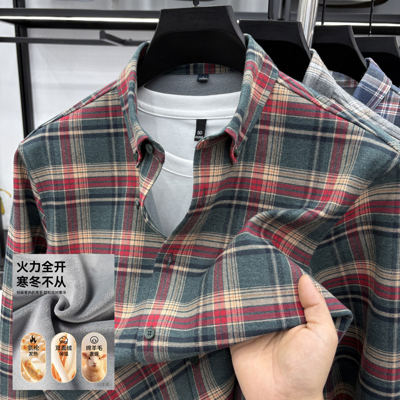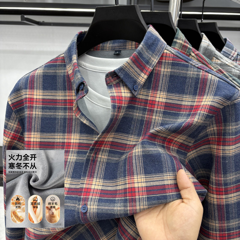 保罗纯棉保暖衬衫男加绒加厚冬季商务休闲一体绒中年男装长袖衬衣