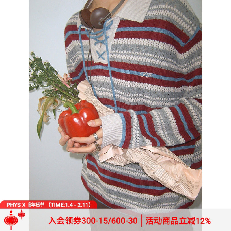 物理少年 逃离计划系列「雪国列车」美式复古条纹Polo领绑带毛衣