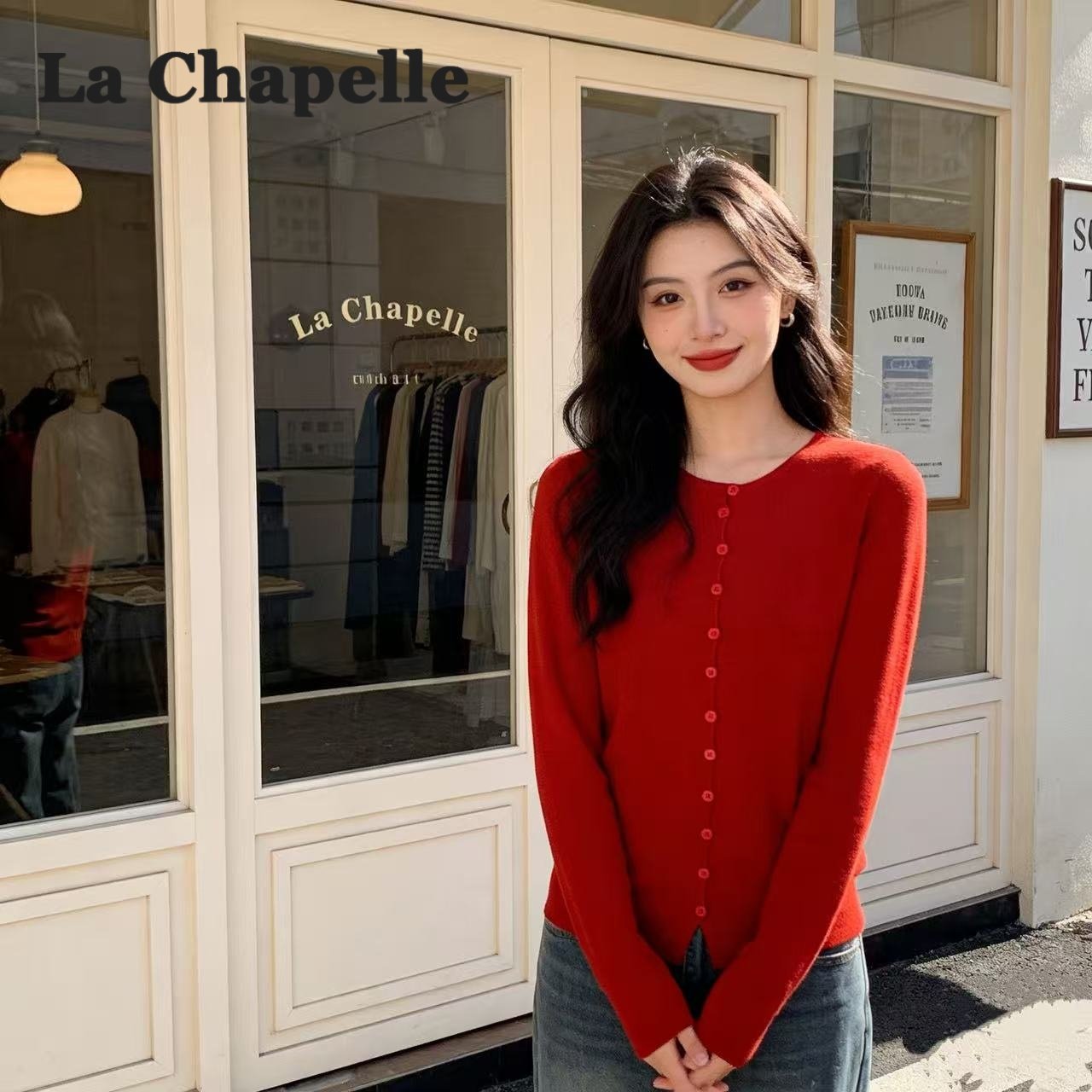 拉夏贝尔巨好看的红色毛衣针织开衫女秋冬气质修身内搭打底衫上衣