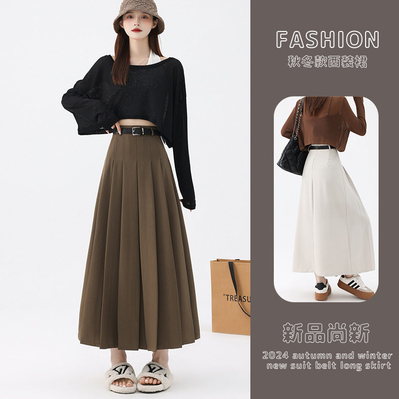 秋冬半身裙中长女款高腰显瘦百褶裙皮带秋冬高腰西装优雅时尚裙子