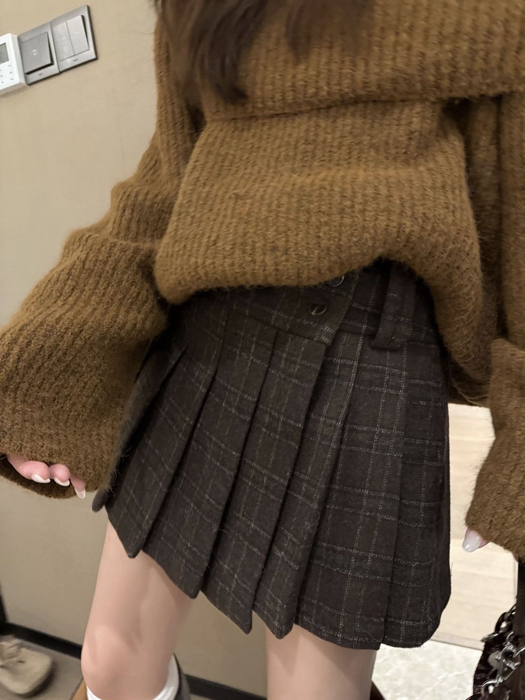 TB秋冬季新款女款短裙时尚百搭高腰半身裙羊毛呢格子拼接百褶裙