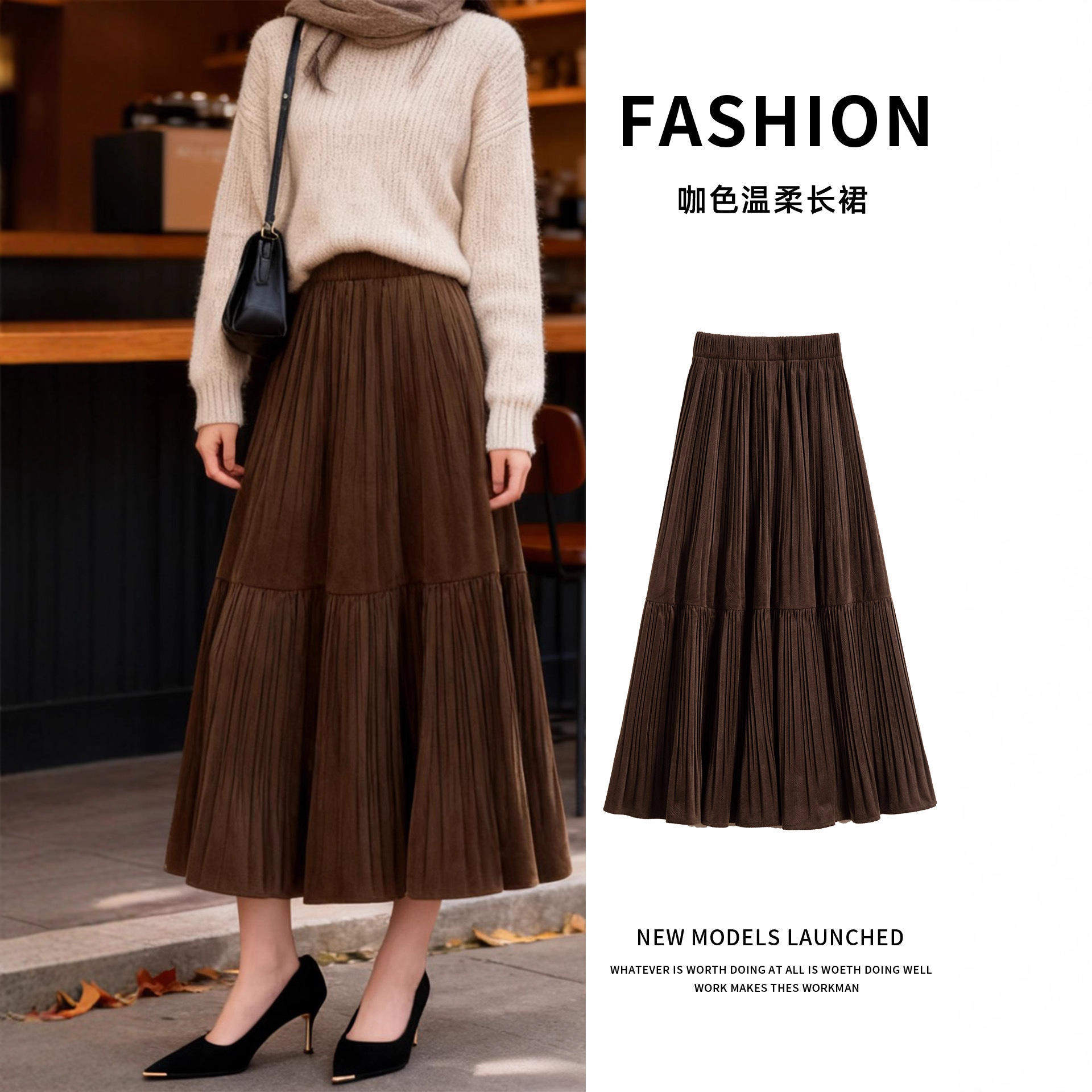 咖色金丝绒半身裙女款2025新款秋冬季毛呢半裙大码胖显瘦百褶裙