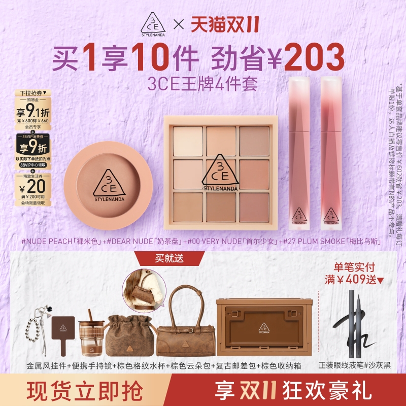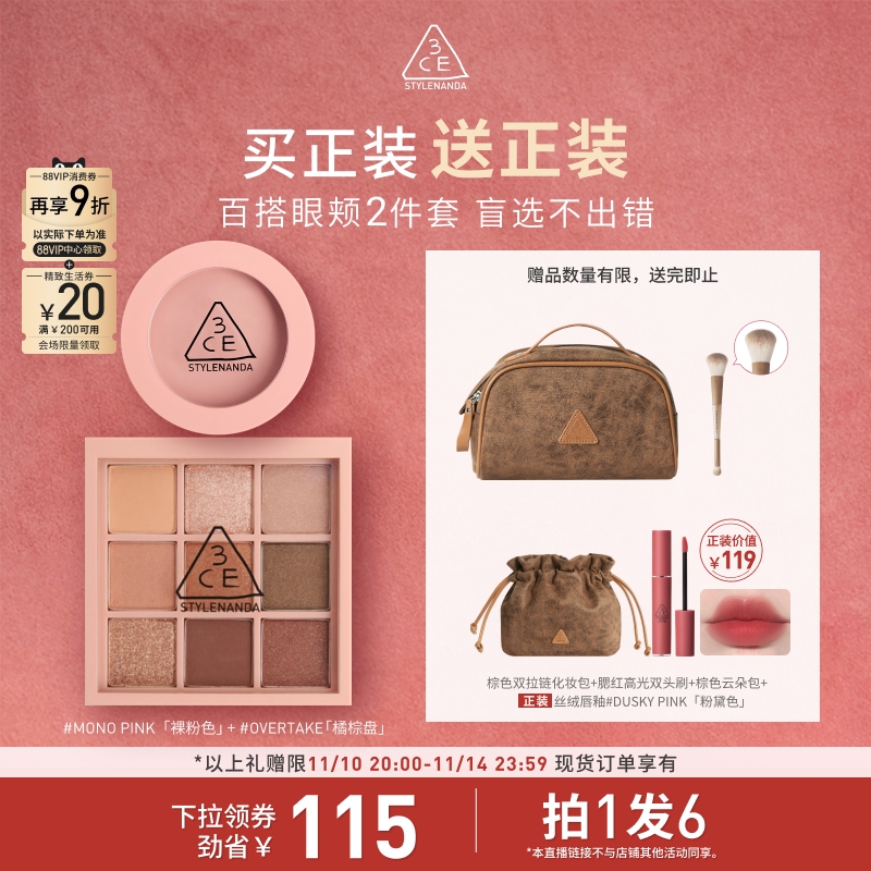 【香菇双十一】3CE眼影盘腮红套装九宫格唇釉口红裸粉色NHO