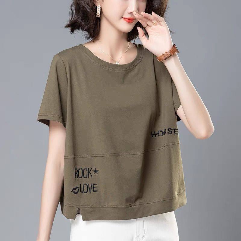 中年妈妈纯棉t恤短袖女2025年新款夏季大码宽松遮肚圆领全棉上衣