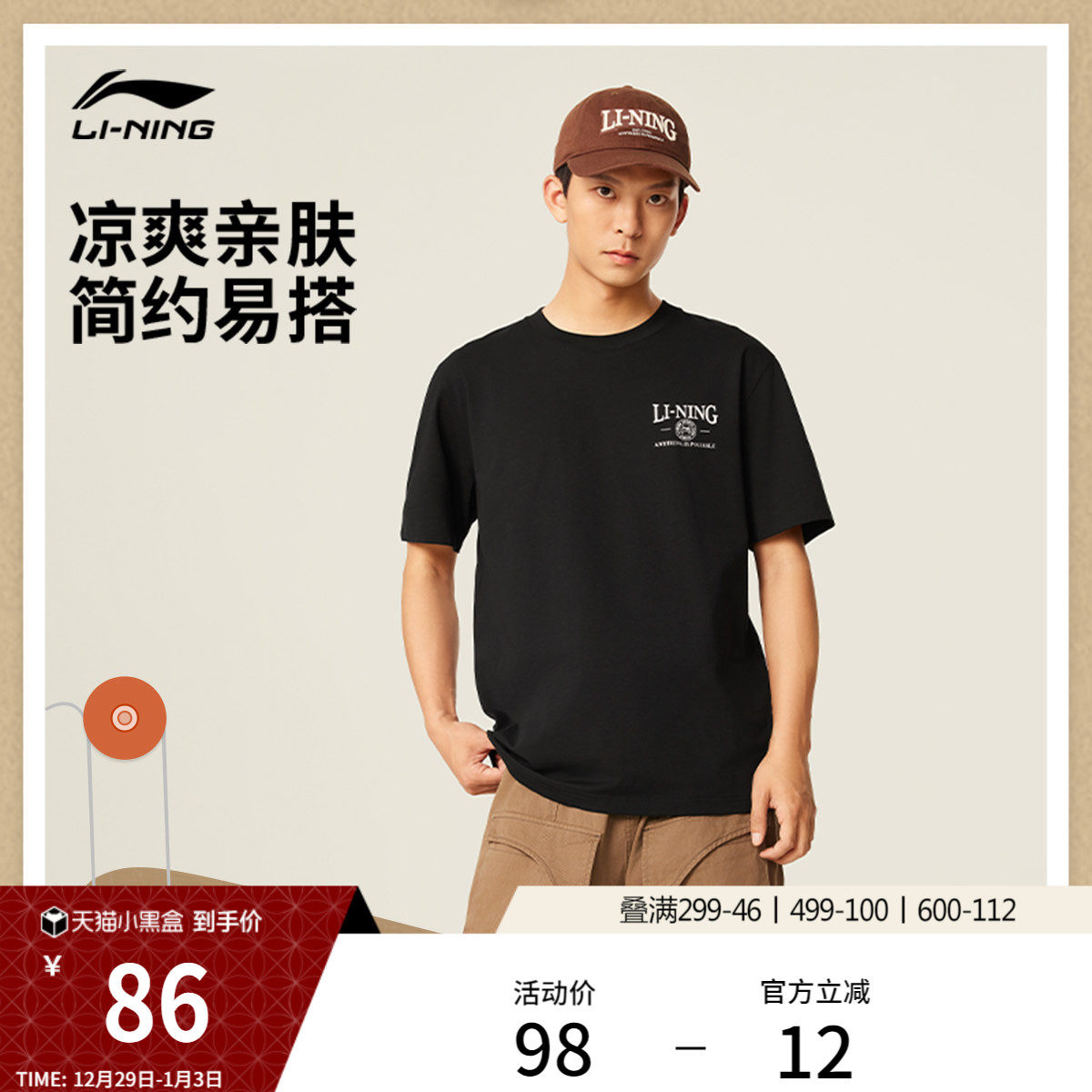 李宁短袖男士官方夏季半袖简约盐系情侣装黑色体恤纯棉运动T恤女