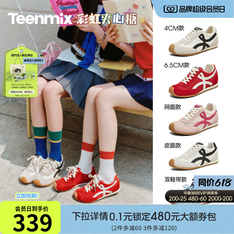 天美意彩虹夹心糖内增高厚底红色阿甘德训鞋女网面透气休闲运动鞋