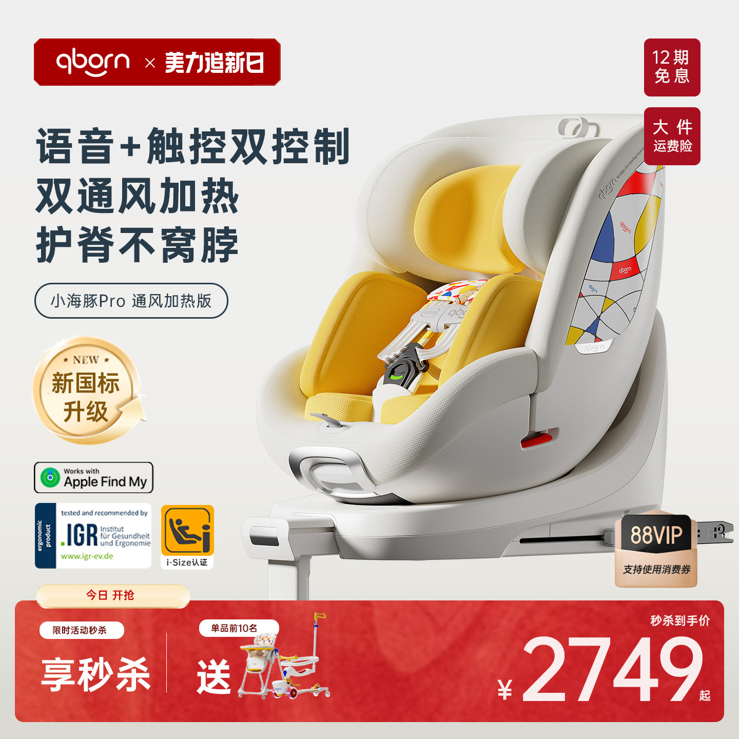 qborn小海豚pro小米汽车安全座椅新国标0-7岁宝宝新生儿通风加热