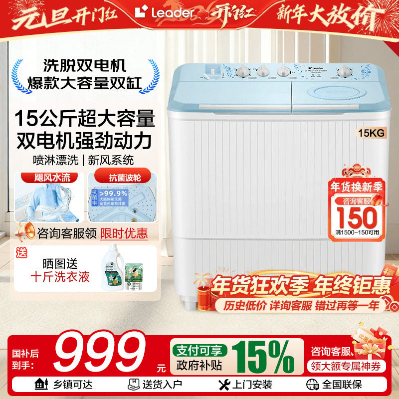 [大容量双缸]海尔双缸洗衣机半自动家用双桶10/15公斤洗脱旗舰