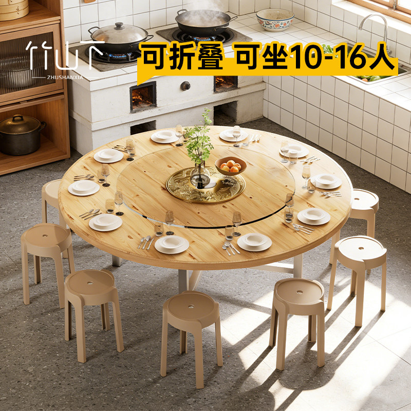 实木可折叠餐桌12人15人吃饭桌子圆形饭桌带转盘大圆桌原木色餐桌
