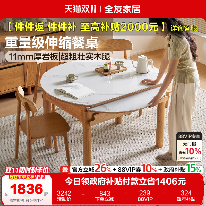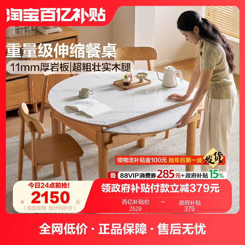 原木色岩板餐桌实木可伸缩折叠圆形饭桌现代简约中式家用方圆两用