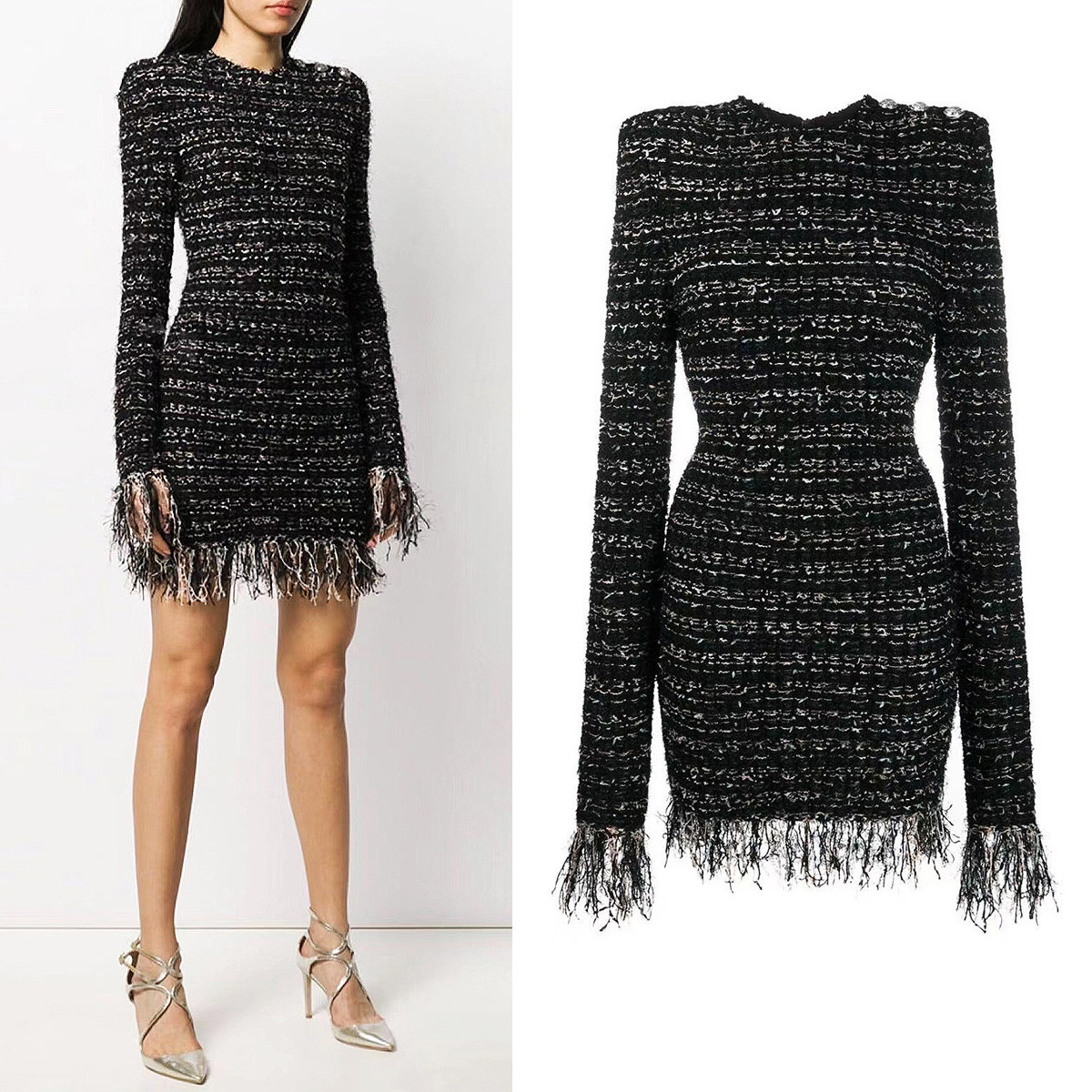 2025年新款亮丝毛呢流苏边长袖修身短款连衣裙高品质女装毛呢裙子