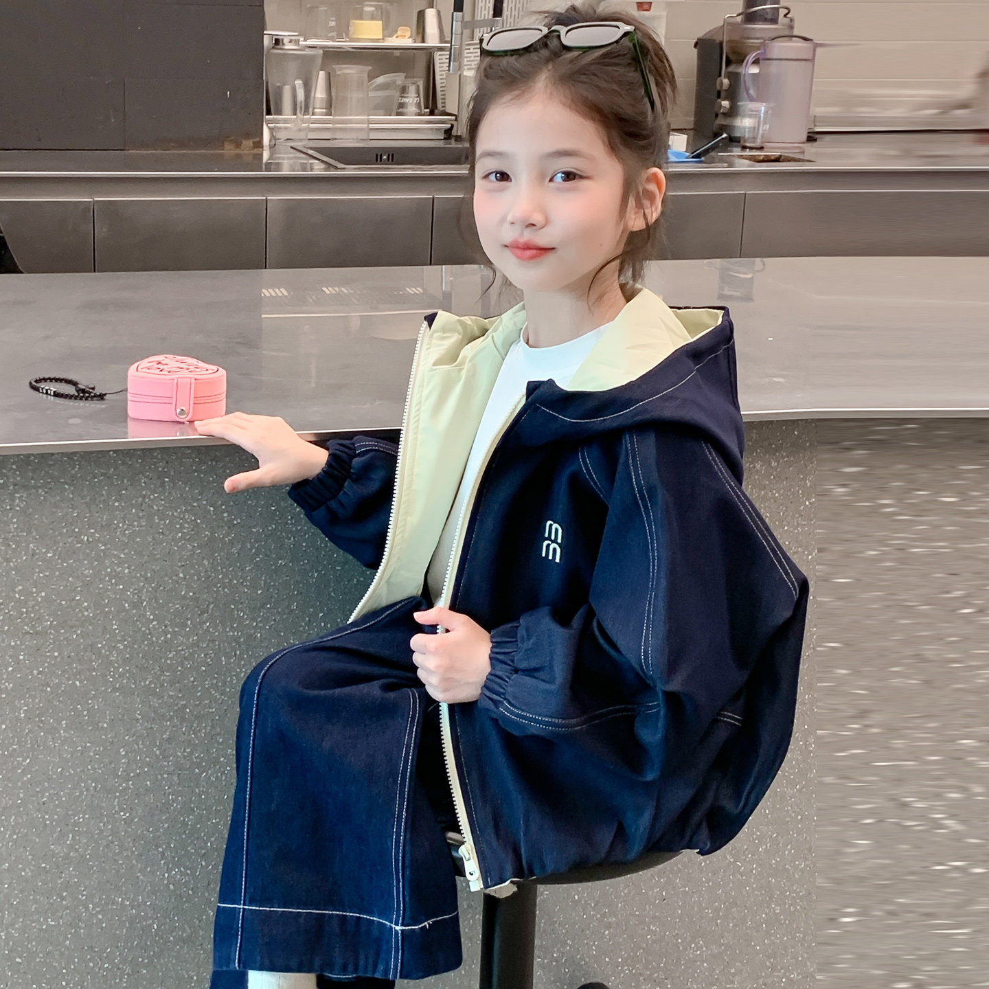 女童春秋季连帽牛仔外套初中学生韩版宽松拉链上衣中大童长袖夹克