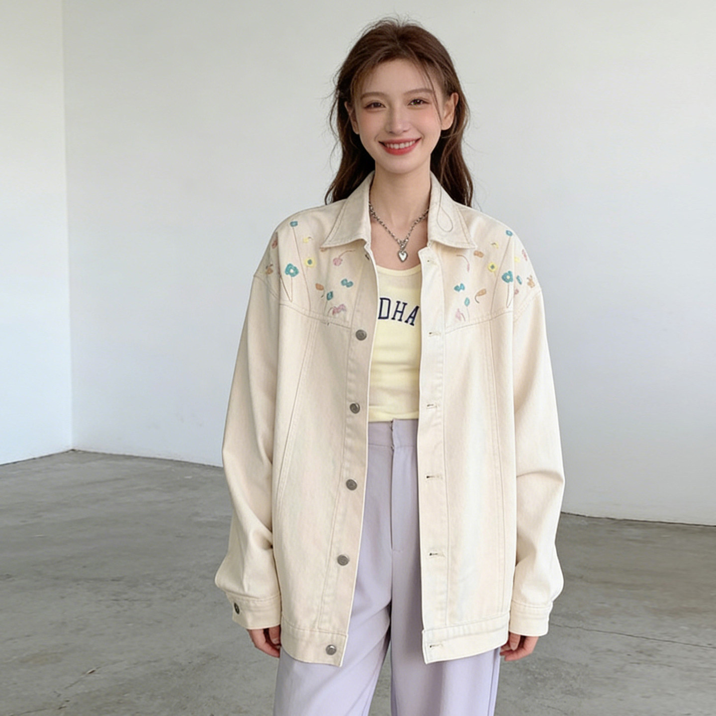 实拍2025秋季韩版宽松刺绣米白色牛仔外套女学生甜美上衣牛仔衣