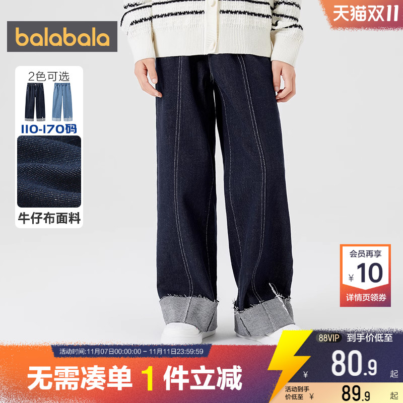 巴拉巴拉女童牛仔裤中大童裤子春秋新款童装儿童加绒阔腿长裤冬季