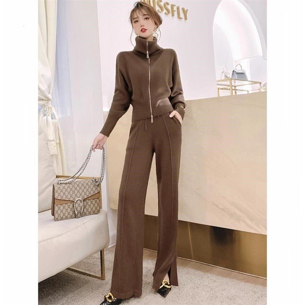 时尚套装春秋季韩版新款女翻领拉链外套高个子阔腿长裤冬天两件套