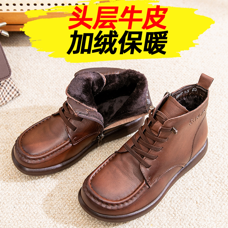 中老年人皮鞋妈妈鞋真皮棉鞋软底防滑女鞋秋冬牛筋底平底奶奶短靴