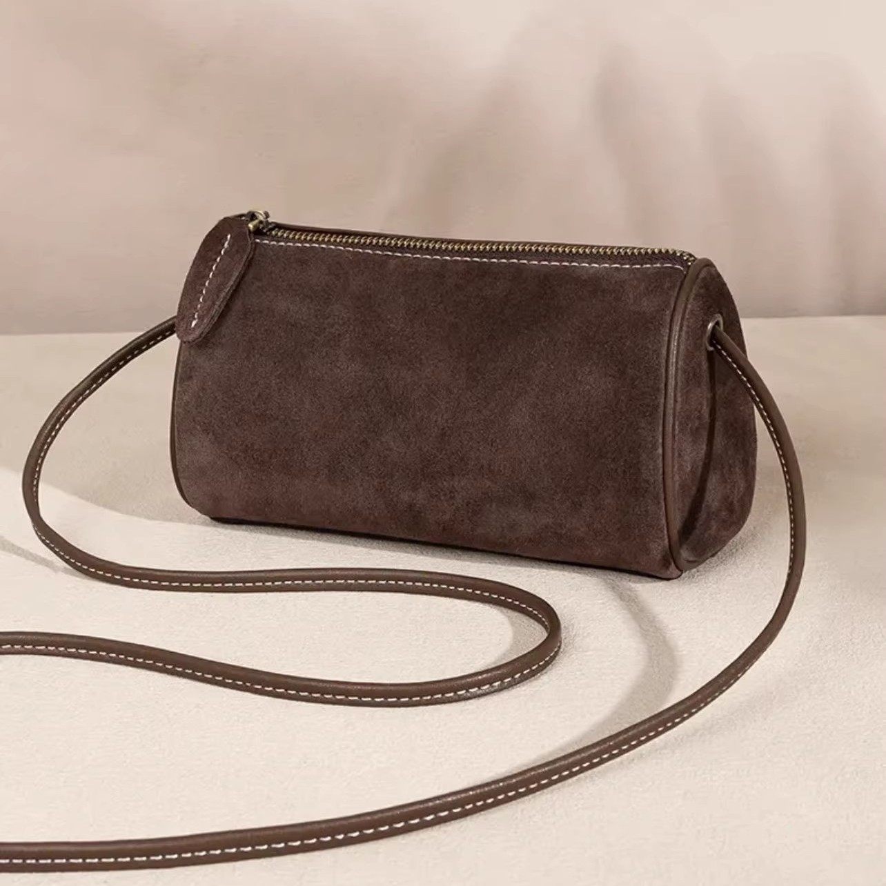 秋冬季小众手机包时尚休闲复古绒面软皮圆筒包水桶包单肩斜跨女包