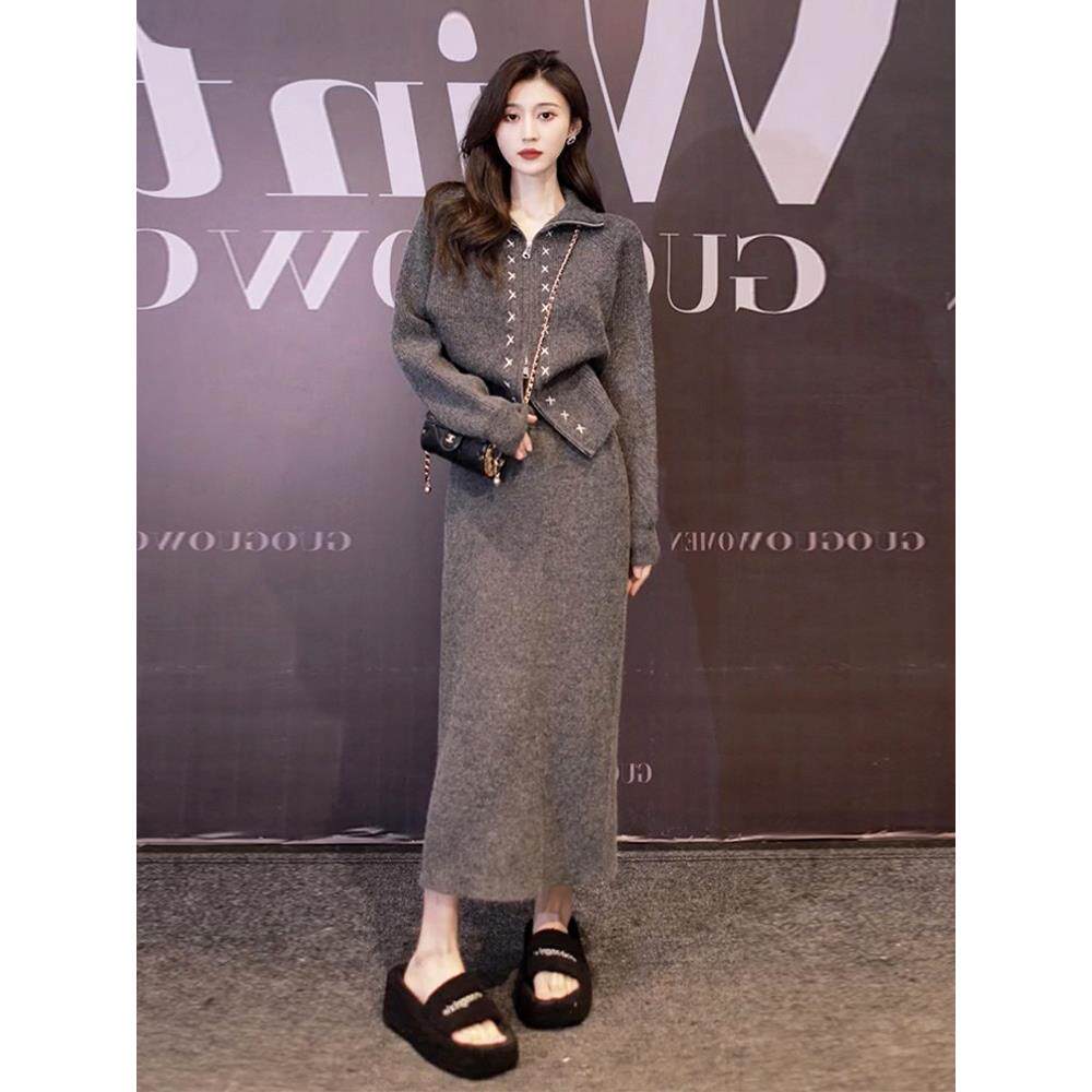 欧洲站2024秋冬季新款女装灰色高级感毛衣套装针织连衣裙子两件套
