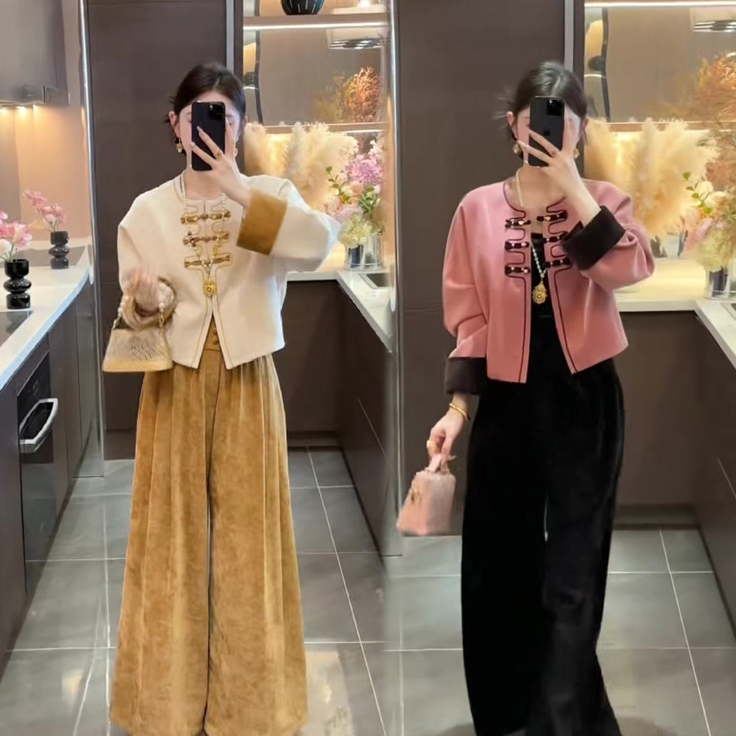 新中式国风时尚套装女秋冬新款盘扣撞色外套+高腰阔腿长裤两件套