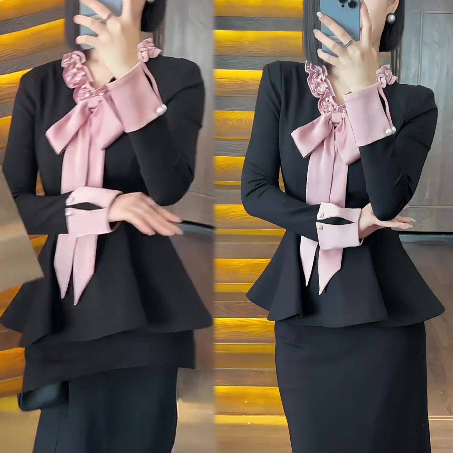 御姐风时尚套装女秋冬新款拼接蝴蝶结上衣+高腰韩版半身裙两件套