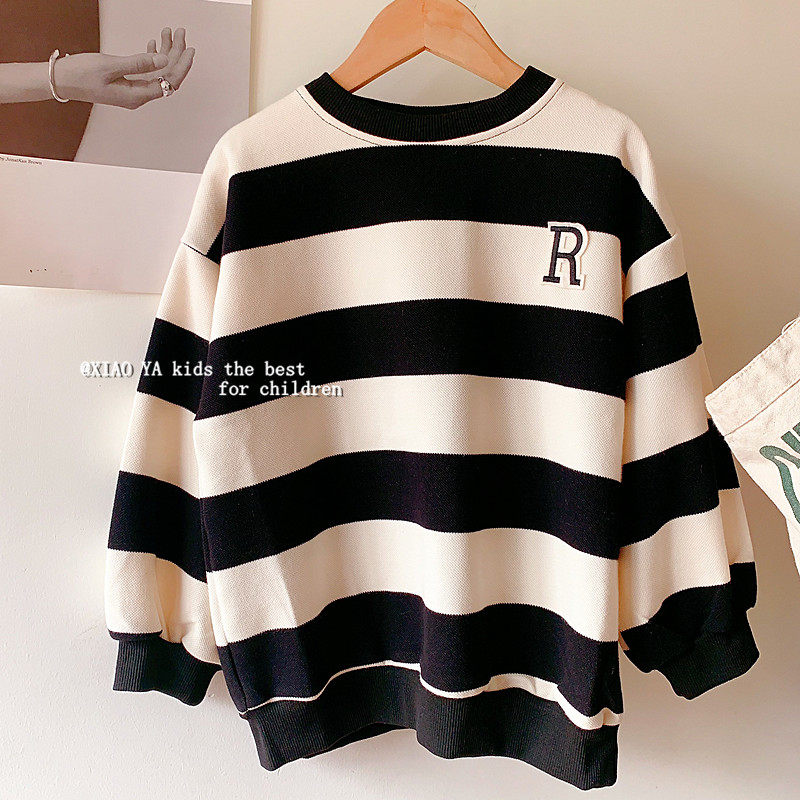 韩国女童条纹圆领卫衣春秋款儿童宽松套头衫女孩慵懒风中长款上衣
