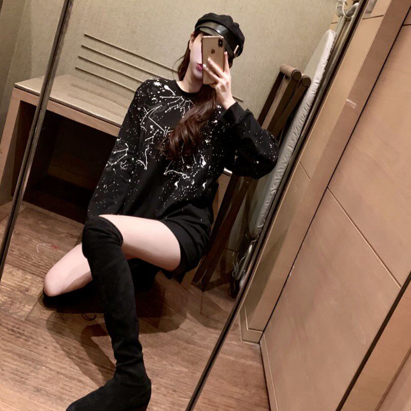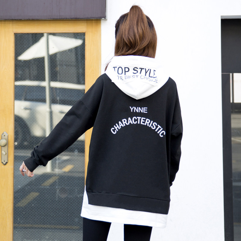春秋新款大码宽松卫衣女长袖套头圆领黑色中长款时尚拼接上衣外套