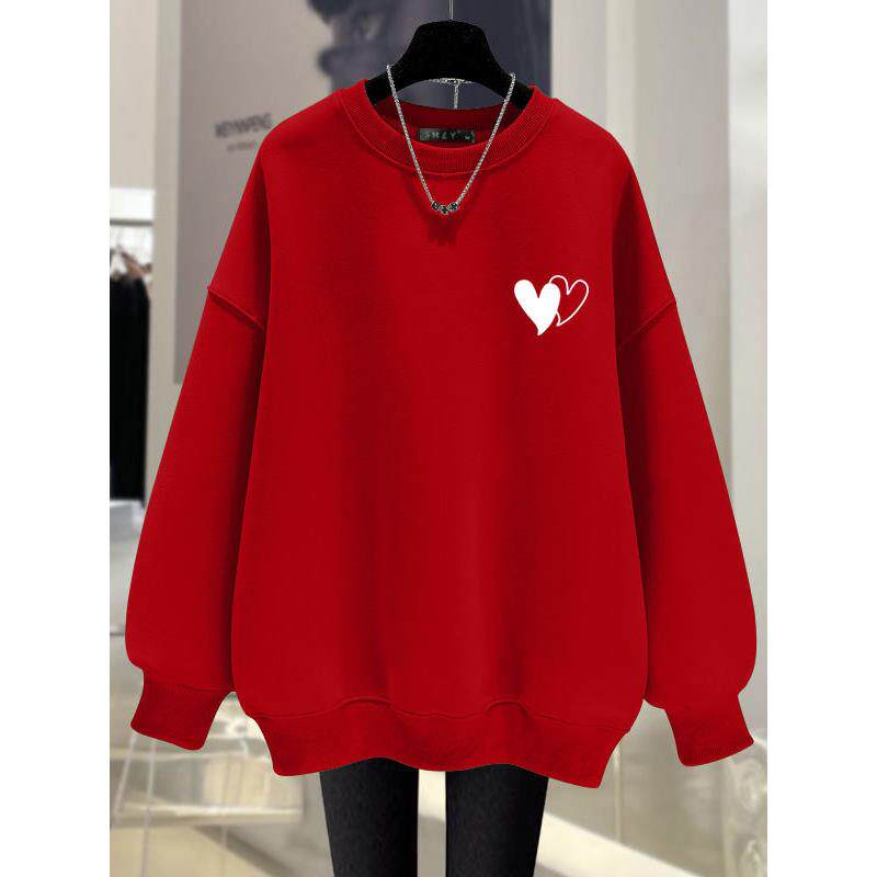红色爱心圆领套头卫衣女2025新款春秋冬季韩版简约加绒中长款上衣