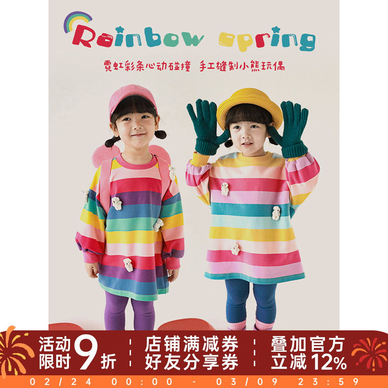 幼悠女童中长款卫衣可爱卡通彩虹条纹上衣宝宝春秋新款宽松套头衣