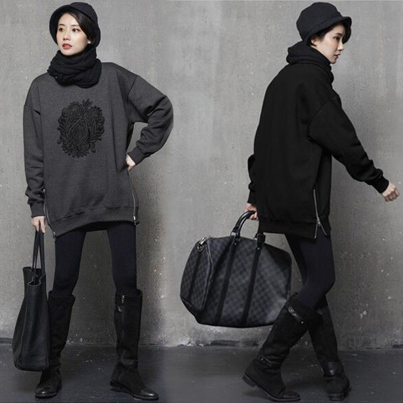 韩国文艺宽松大码刺绣中长款加厚加绒抓绒女套头卫衣春秋清仓特价