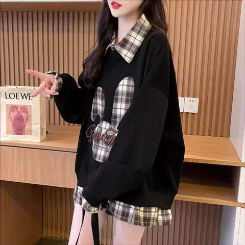 套头卫衣女春秋薄款中长款学生宽松韩版慵懒风特大码胖mm格子上衣
