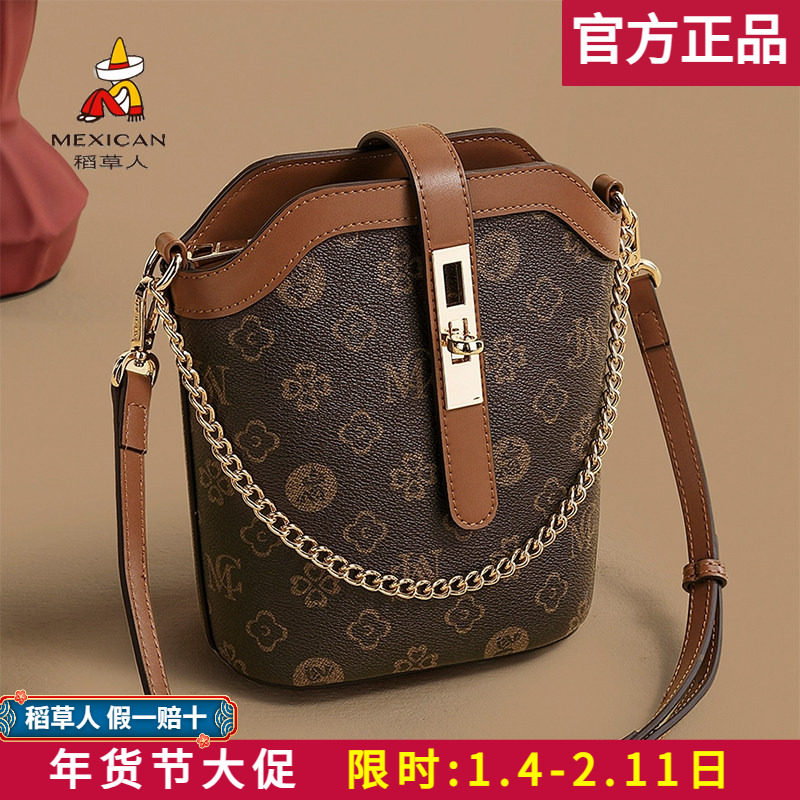 稻草人女包2025新款复古水桶包美拉德风斜挎包精致单肩手提包正品